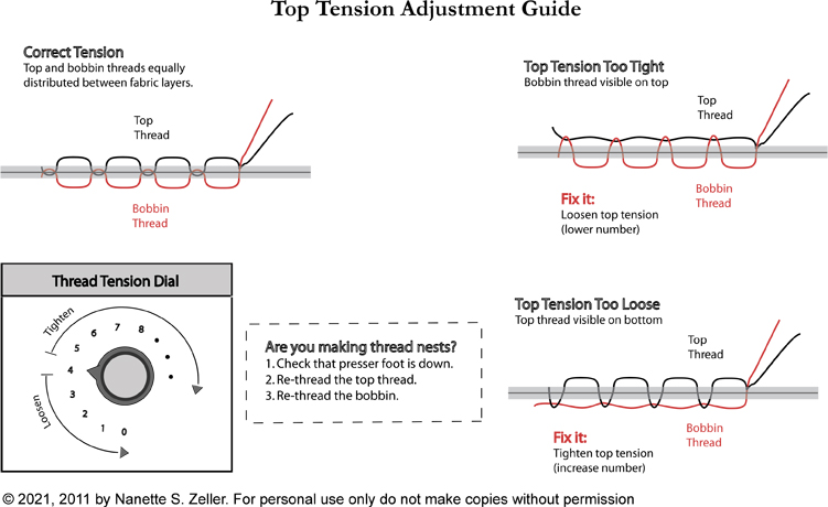If your sample stitching indicates an adjustment is needed, you can refer to the chart on this page which indicates what you do for each scenario (feel free to right-click on the image and save it to your computer). Make minor adjustments at a time and check your stitching again. Check both front and back of your work because it’s possible to over compensate. Did you solve the issue? If not, make some more adjustments.
